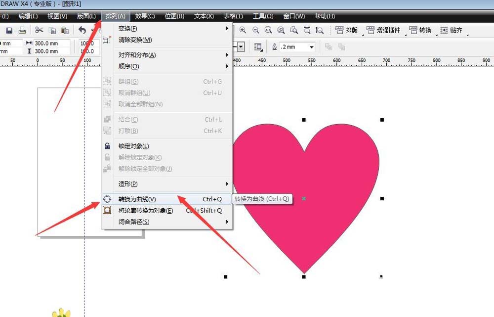 3、將心形轉化為曲線。在排列菜單欄下,有一個轉化為曲線,這是為了編輯心形,改變他的形態