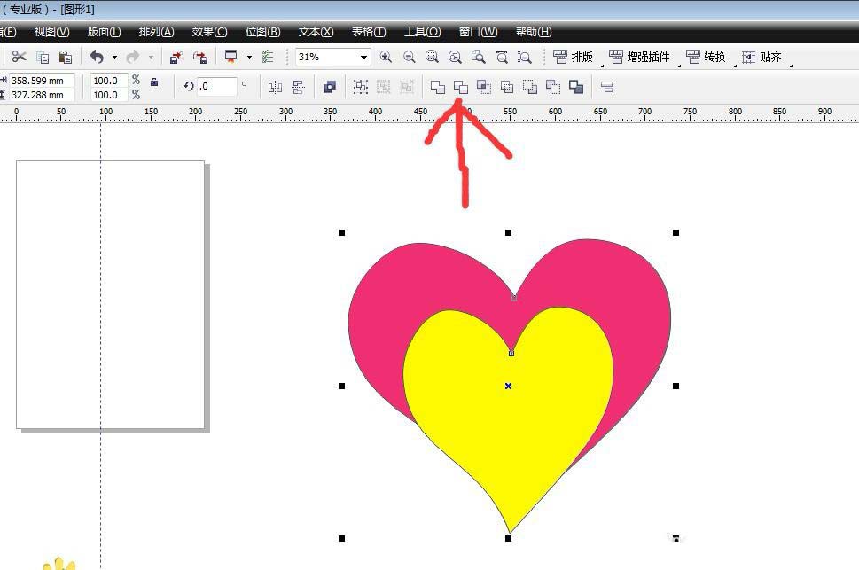 6、選擇兩個心形,在屬性欄中選擇修剪,將多余的部分刪掉,就變為了一個空心的心形