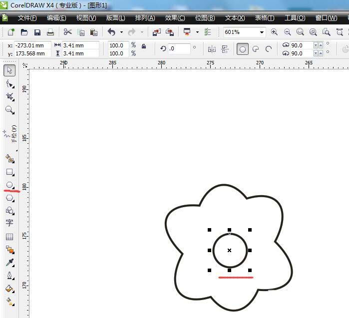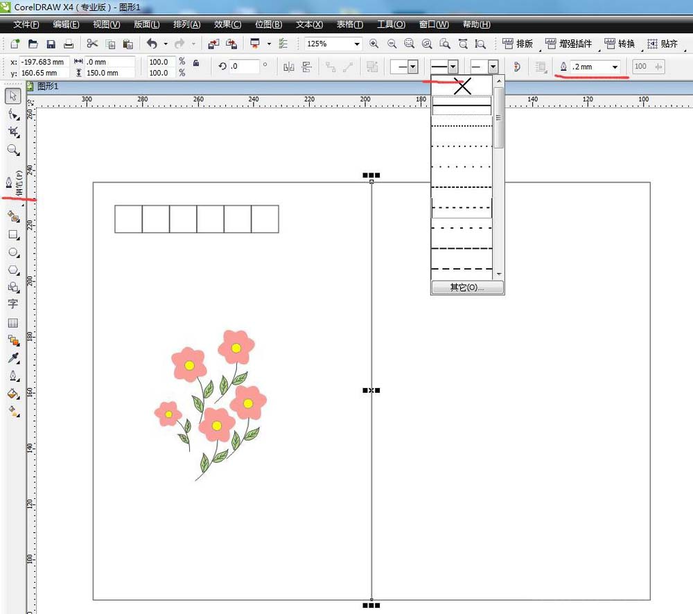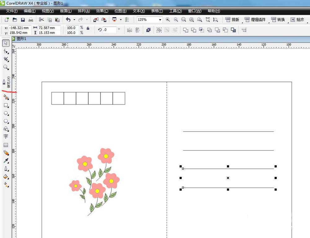 3、選擇要填色的部分,左鍵填充顏色,右鍵點擊空白方塊取消輪廓。選中根莖右鍵顏色,填充顏色。依次填充好所有的色塊完成一朵。復制幾朵擺好位置。用鋼筆工具畫直線,兩點連接得到直線,調整直線為虛線,調整線條粗細。同樣方法畫出信箋位置。