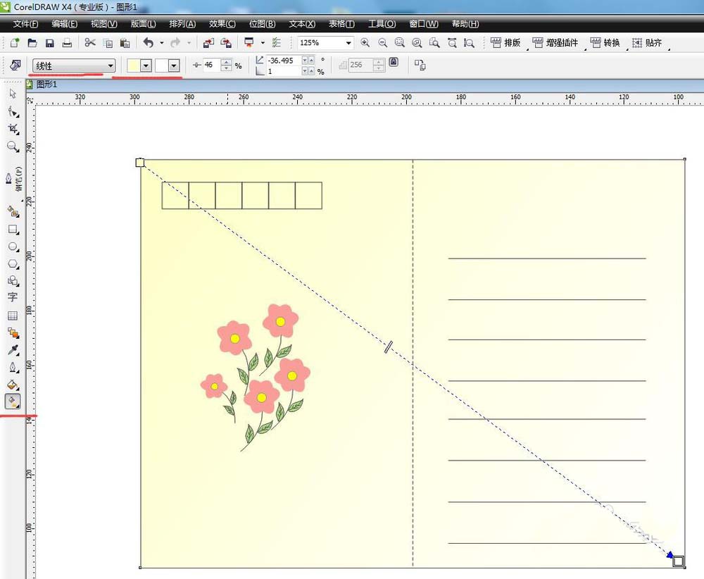 4、選中外框,點擊交互式填充工具,選擇顏色,填充效果,拉動鼠標左鍵可隨意調整填色位置。再復制兩朵小花點綴,完成明信片設計。