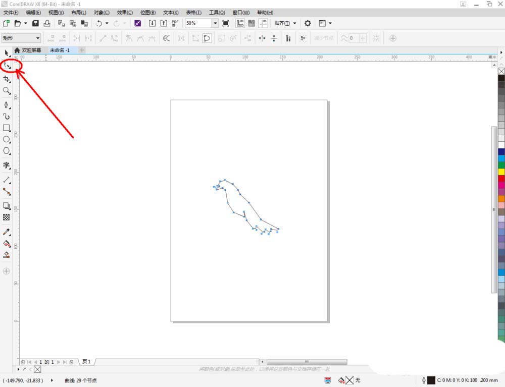2、點擊【鋼筆工具】按圖示繪制一個多邊圖案后,點擊【形狀工具】,框選圖案上的節點,點擊【轉化為曲線】將節點轉曲。完成后,選中圖示圖案上的節點,點擊【平滑節點】將節點進行平滑處理并調整好控制點,完成主體部分圖案的制作(如圖所示);