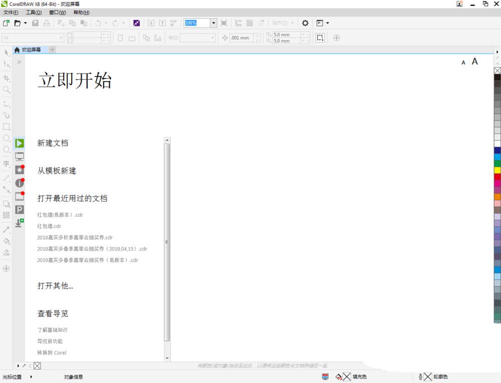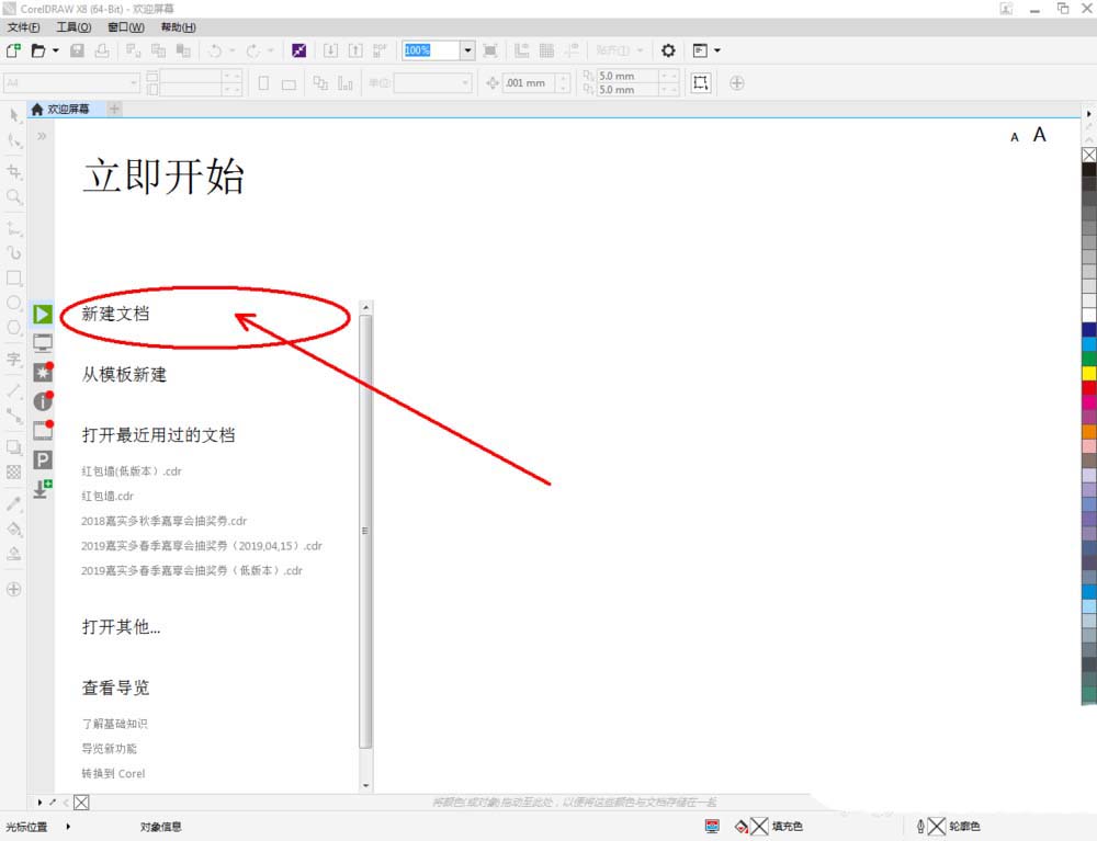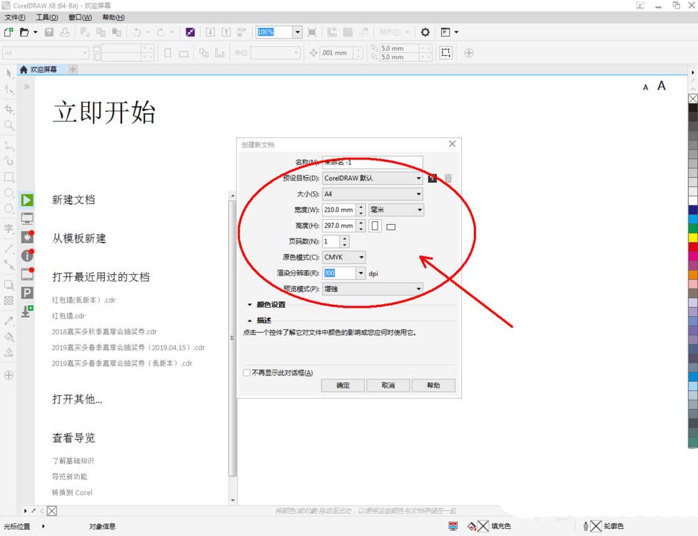 1、打開CorelDRAW X8 軟件,點(diǎn)擊【新建文檔】,按圖示參數(shù)新建一個(gè)cdr文檔(如圖所示);