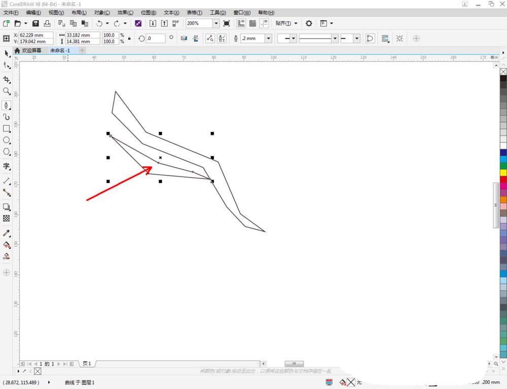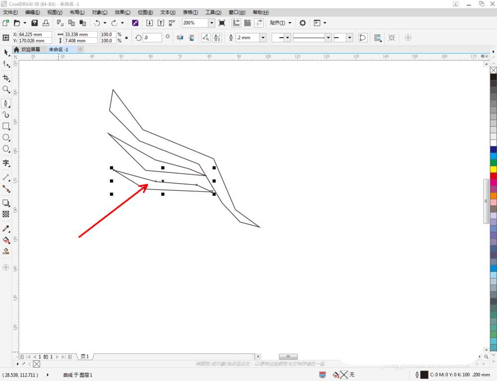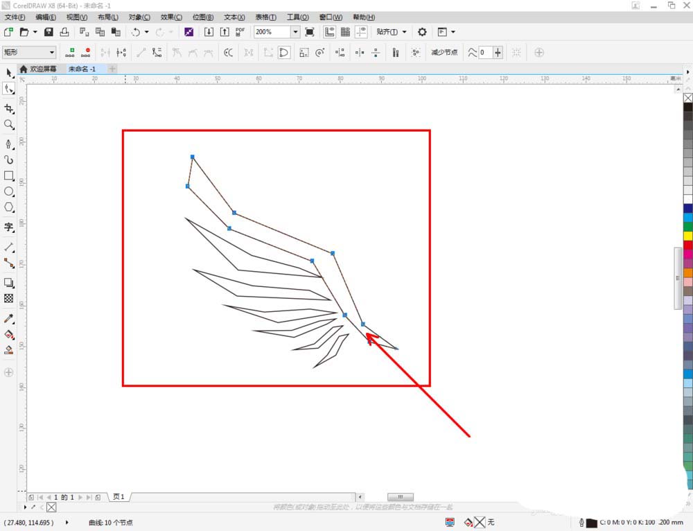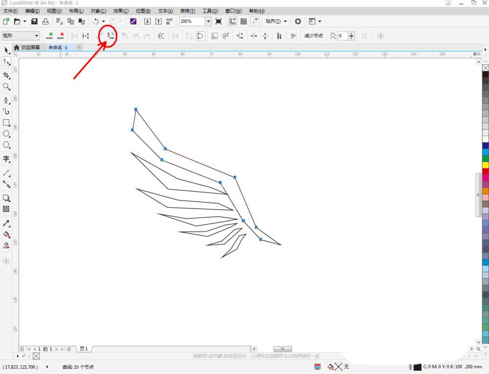 3、點(diǎn)擊【形狀工具】,框選圖案1上的節(jié)點(diǎn)后,點(diǎn)擊【轉(zhuǎn)化為曲線】將節(jié)點(diǎn)轉(zhuǎn)曲。完成后,選中圖示圖案上的節(jié)點(diǎn),點(diǎn)擊【平滑節(jié)點(diǎn)】將節(jié)點(diǎn)進(jìn)行平滑處理并調(diào)整好控制點(diǎn)(如圖所示);