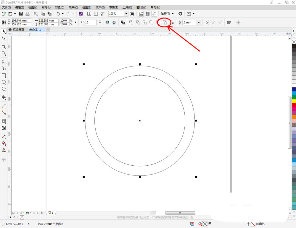 3、點擊【選擇工具】選中所有圖案后,點擊【移除前面對象】將前面部分的對象移除,得到一個圓環圖案。選中圖案,鼠標左鍵點擊右邊色板中的黑色,將圖案填充為黑色;