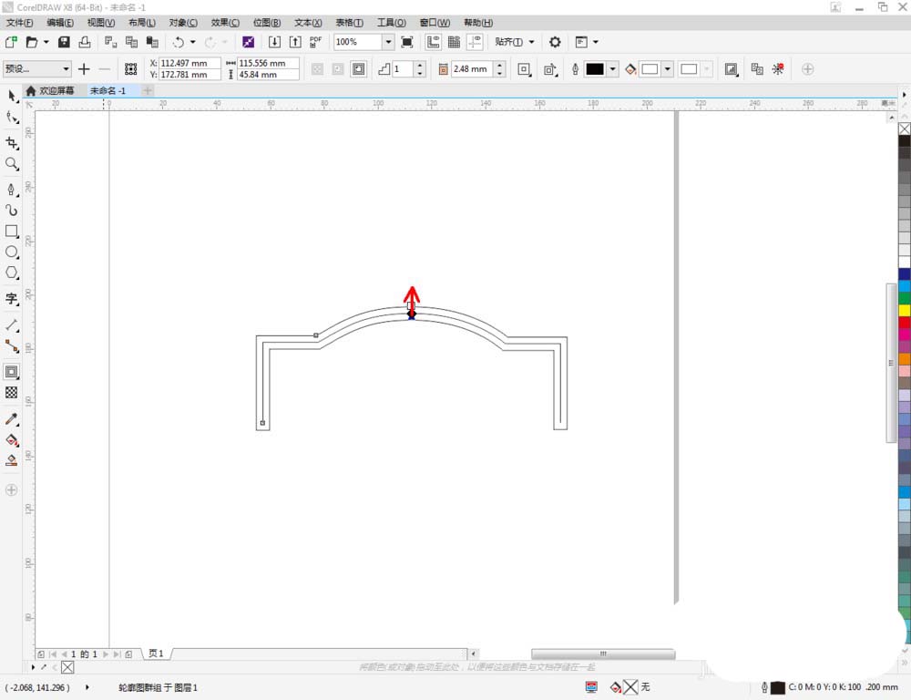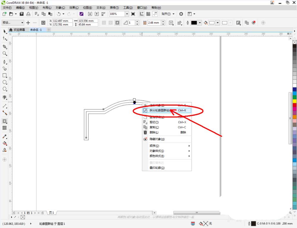 3、點擊【輪廓圖】按圖示對線段圖案進行輪廓處理。點擊鼠標右鍵-【拆分輪廓圖群組】將圖案群組拆分后,將線段圖案刪除(如圖所示);