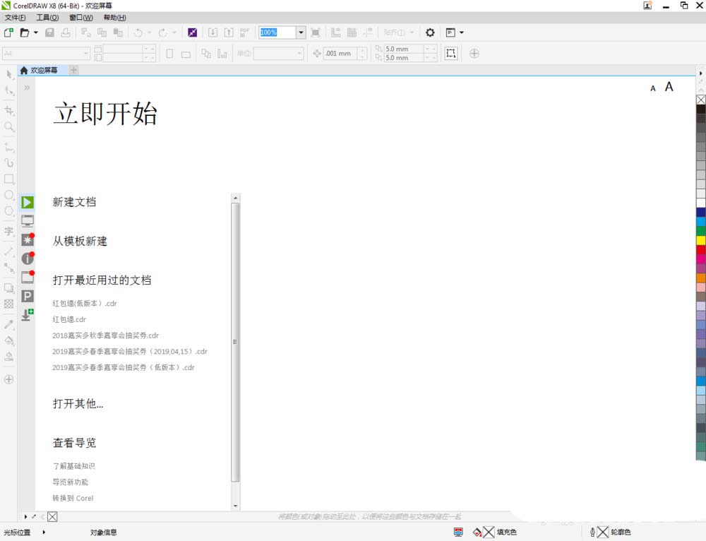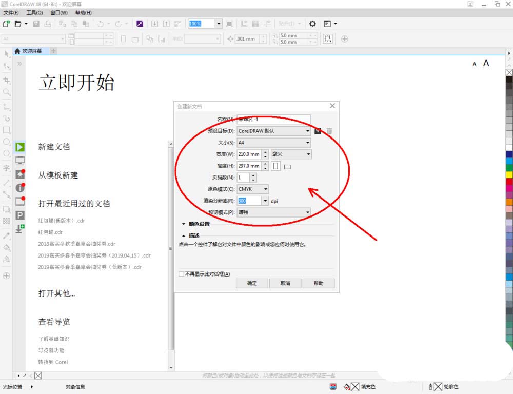 1、打開CorelDRAW X8 軟件,點擊【新建文檔】,按圖示參數新建一個cdr文檔(如圖所示);