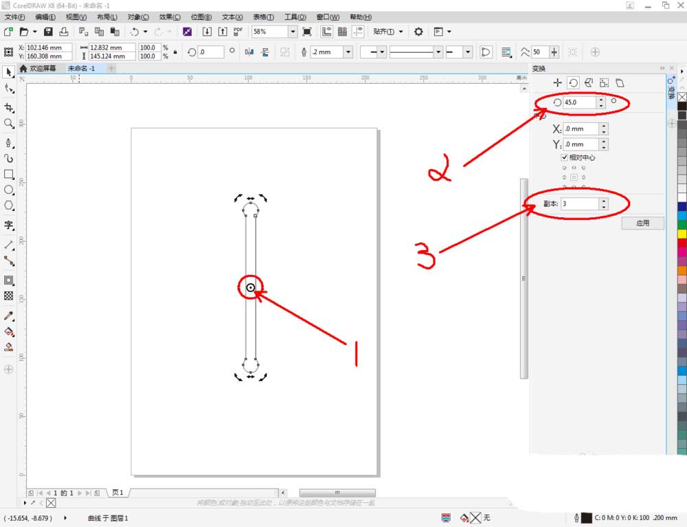 3、點擊【對象】-【變換】-【旋轉】,彈出變換設置框后,鼠標雙擊圖案,將旋轉角度設置為:45,副本數設置為:3后,對圖案進行陣列(如圖所示);,