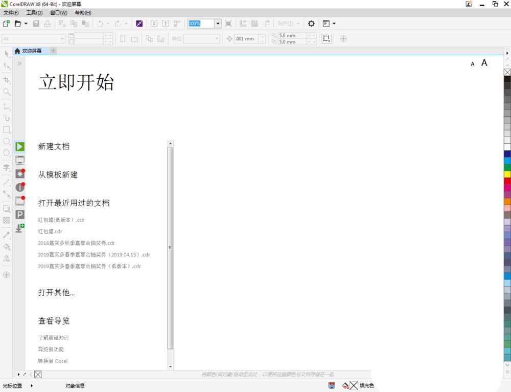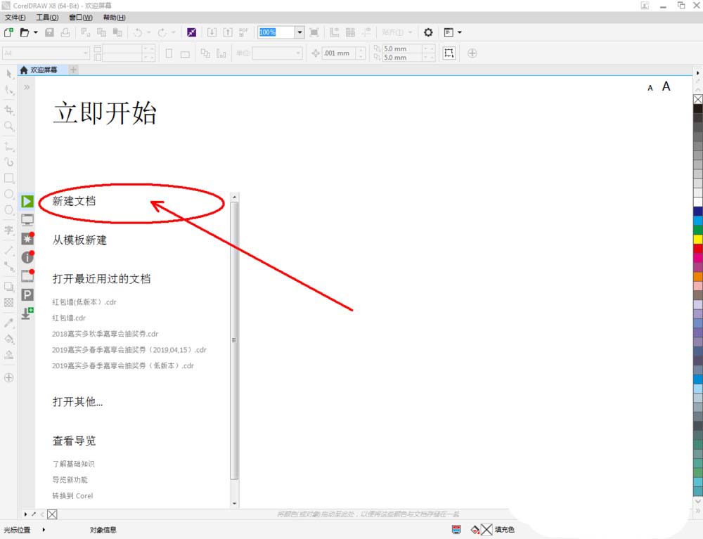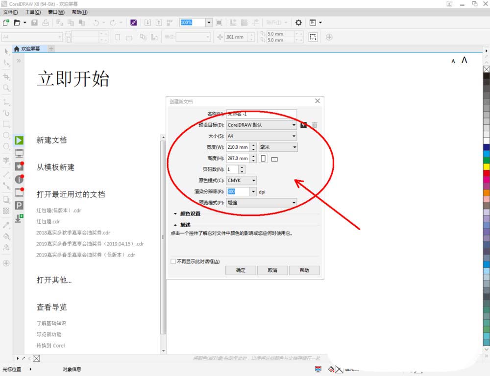 1、打開CorelDRAW X8 軟件,點擊【新建文檔】,按圖示參數新建一個cdr文檔(如圖所示);