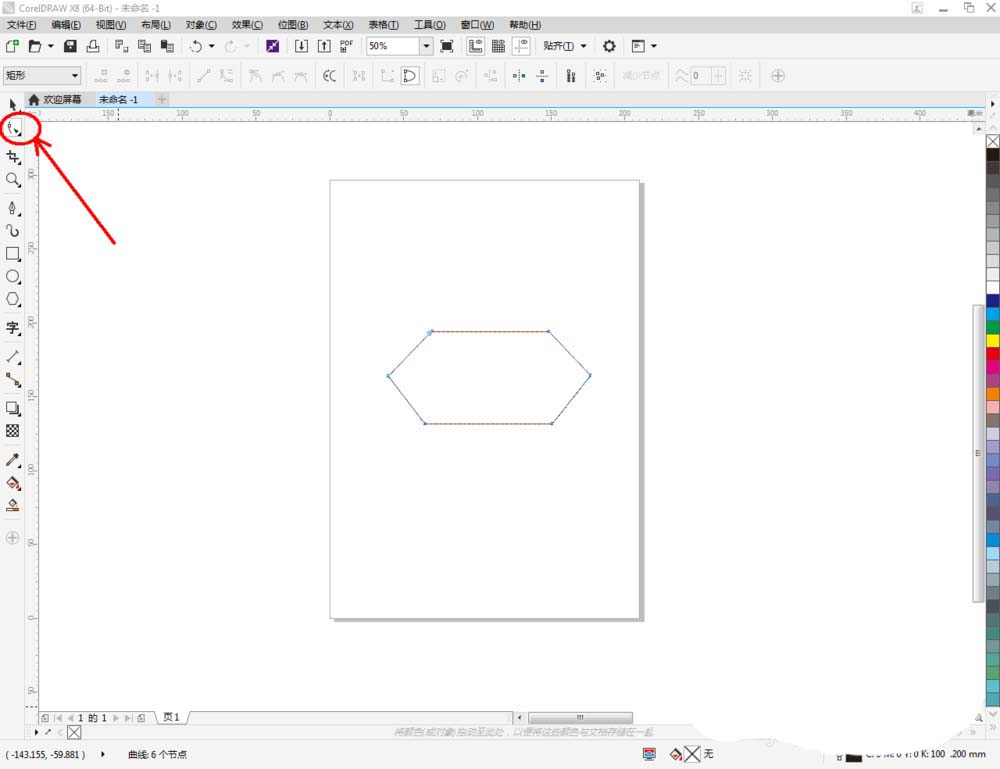 2、點擊【鋼筆工具】,在作圖區域繪制出一個多邊圖案。點擊【形狀工具】,選中圖案上的節點,點擊【轉換為曲線】。選中圖示兩個節點,點擊【平滑節點】并按圖示對控制點進行調整(如圖所示);