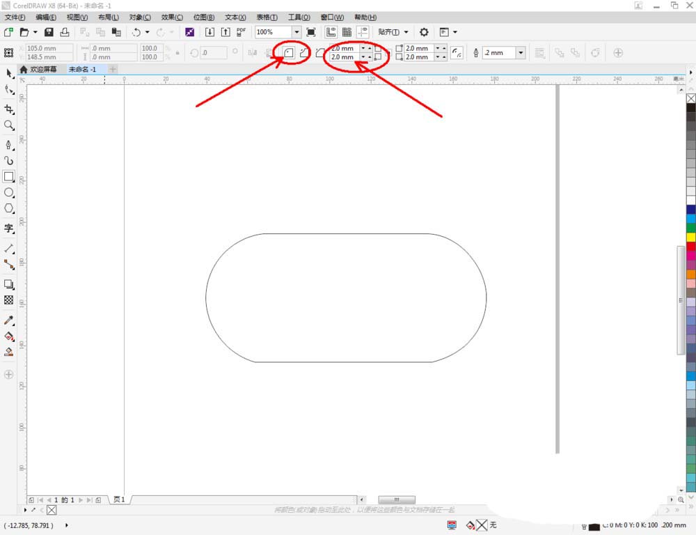 3、點擊【矩形工具】,點擊【圓角】并設置好圓角參數后,在圖示位置繪制一個圓角矩形圖案。完成后,調整圓角參數后繪制出另外一個矩形圖案(如圖所示);