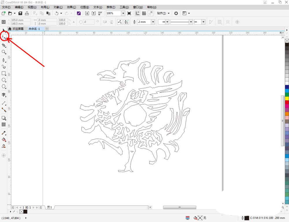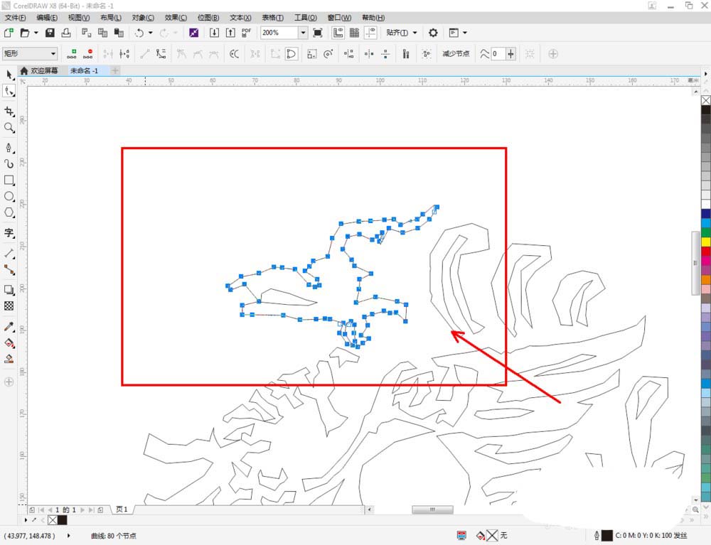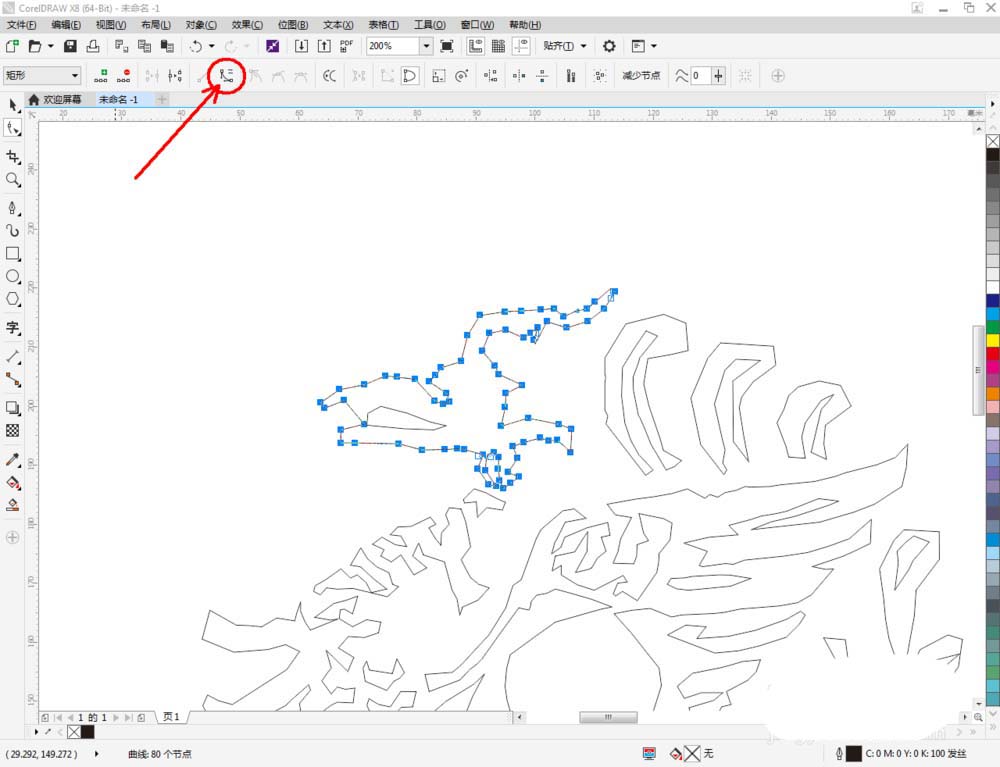 3、選中多邊圖案,點擊【形狀工具】,選中圖案上的所有點,點擊【轉換為曲線】將圖案轉曲后,按圖示調整控制點,完成整個朱雀輪廓圖案的繪制(如圖所示);