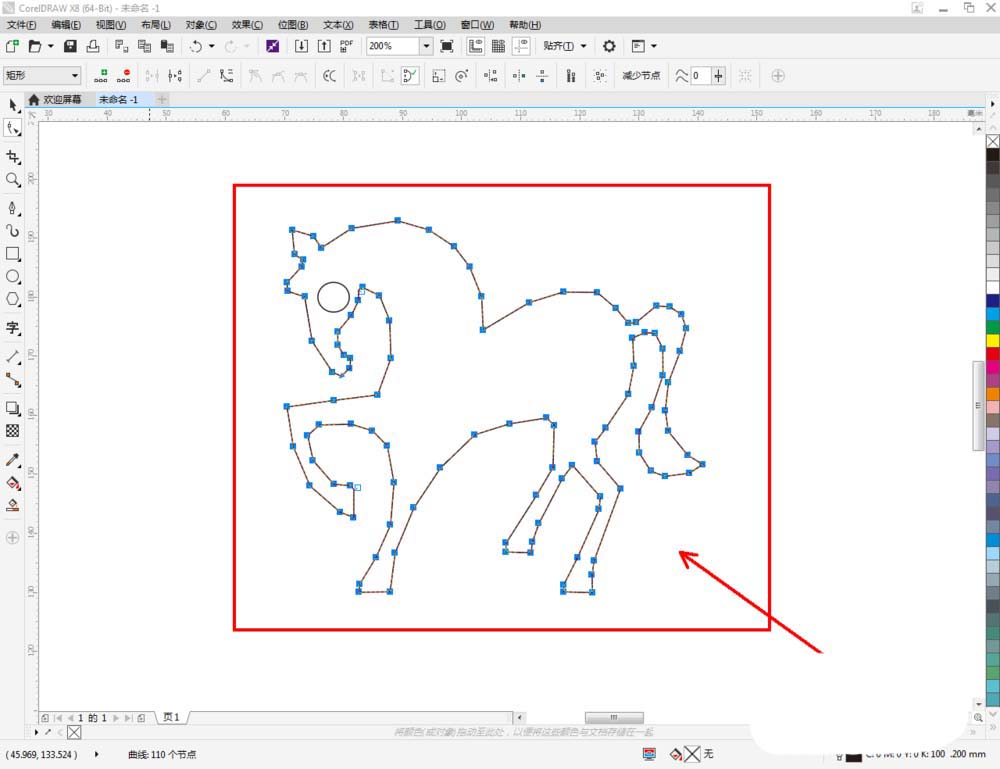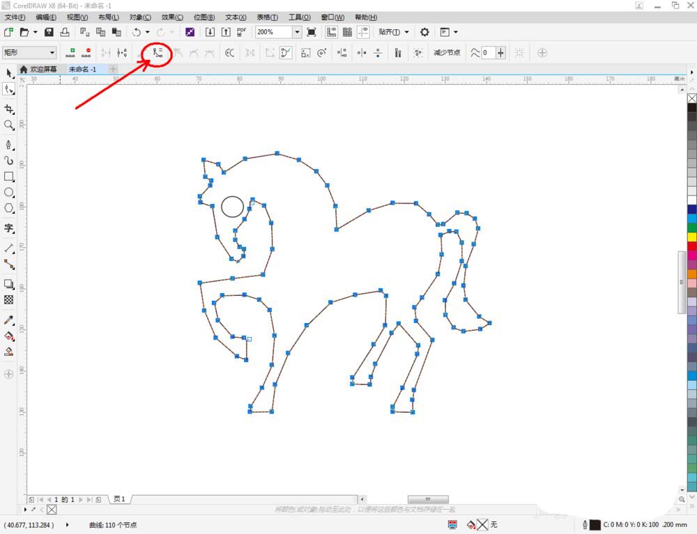 3、選中多邊圖案,點擊【形狀工具】,選中圖案上的所有點,點擊【轉換為曲線】將圖案轉曲后,按圖示調整控制點,完成整個生肖馬輪廓圖案的繪制(如圖所示);