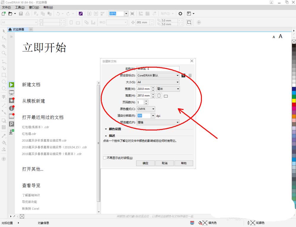 1、打開CorelDRAW X8 軟件,點擊【新建文檔】,按圖示參數新建一個cdr文檔(如圖所示);