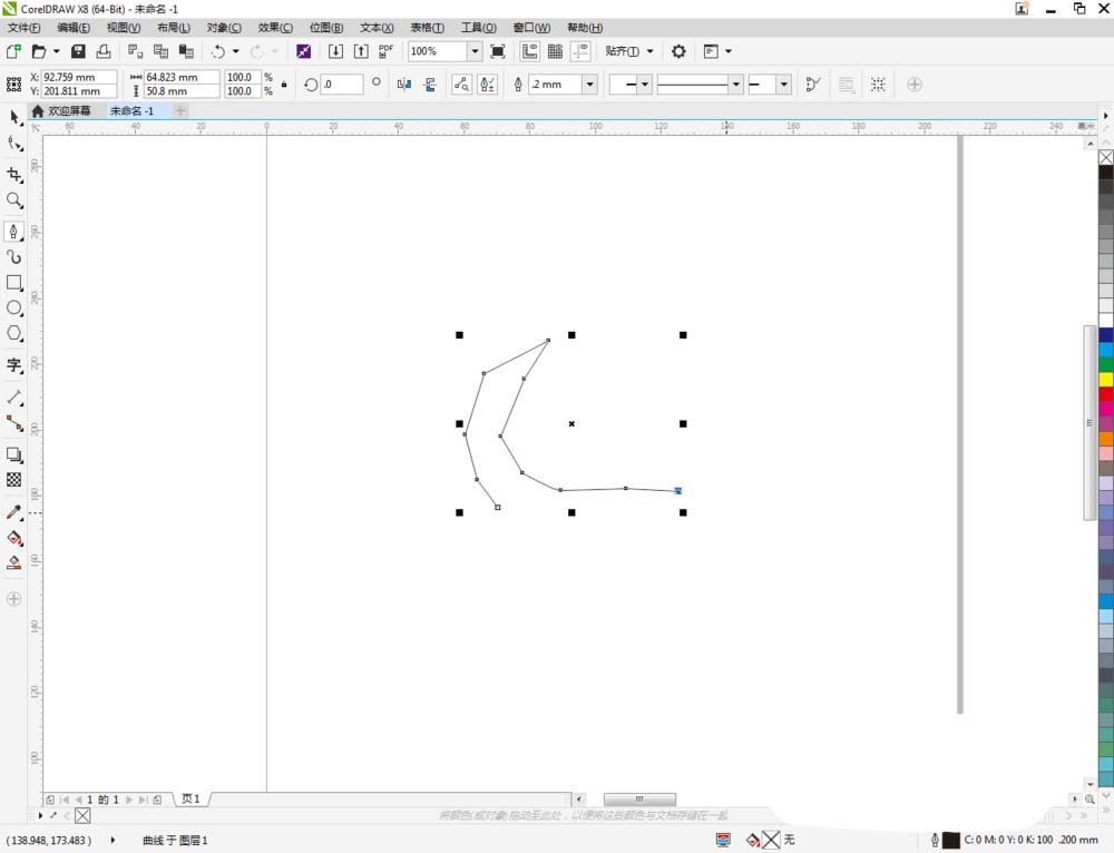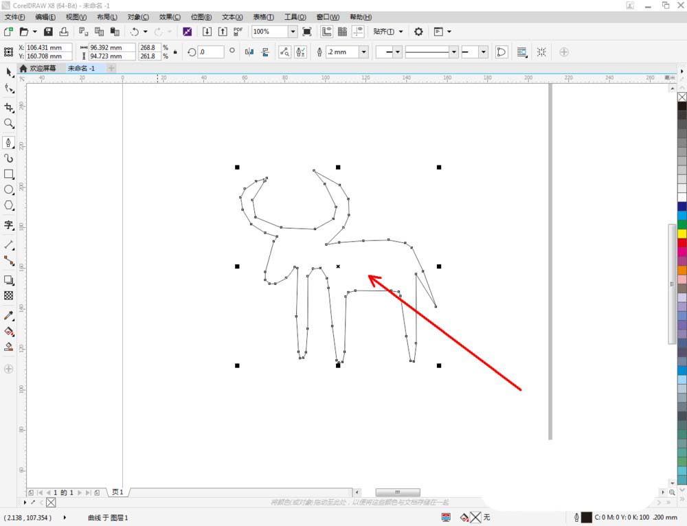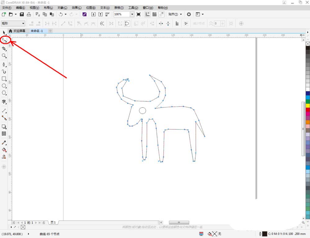3、選中多邊圖案,點(diǎn)擊【形狀工具】,選中圖案上的所有點(diǎn),點(diǎn)擊【轉(zhuǎn)換為曲線】將圖案轉(zhuǎn)曲后,按圖示調(diào)整控制點(diǎn),完成整個(gè)生肖牛輪廓圖案的繪制(如圖所示);