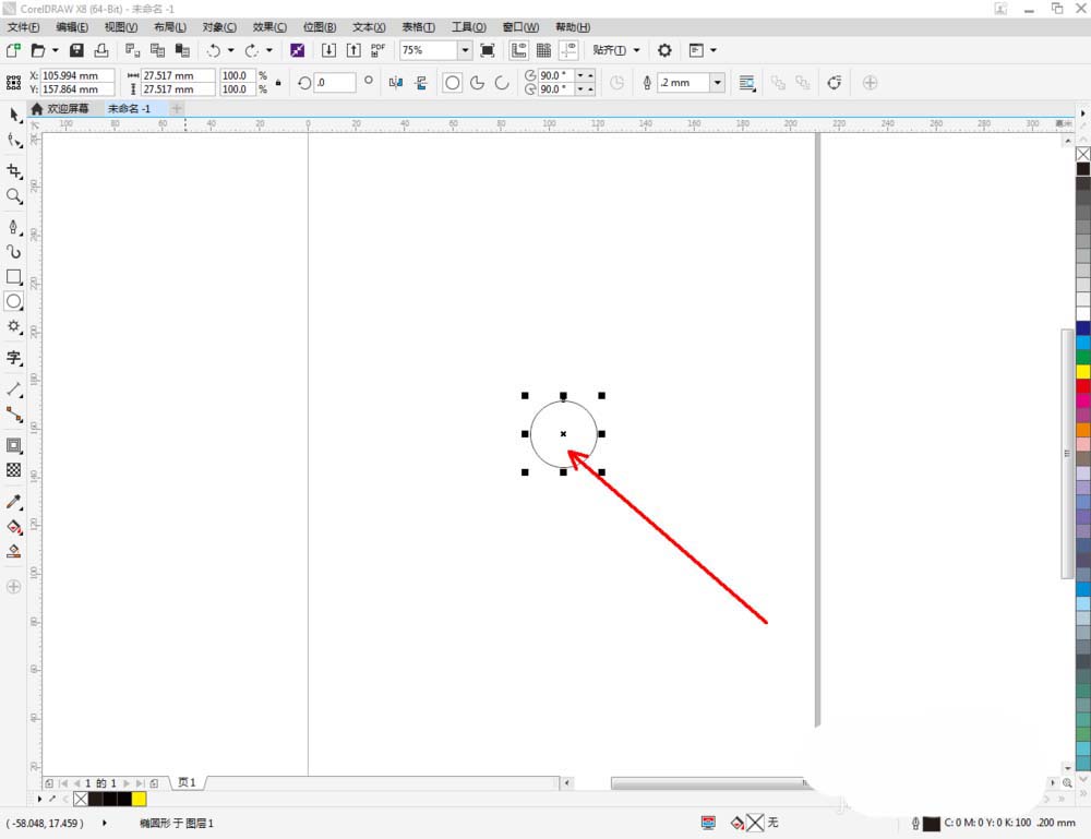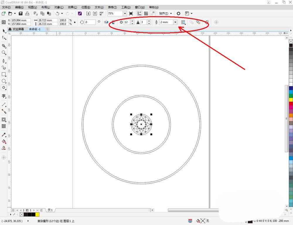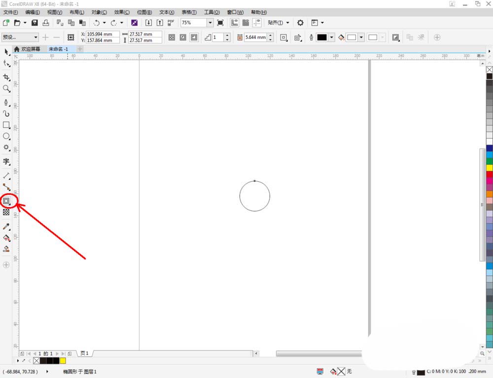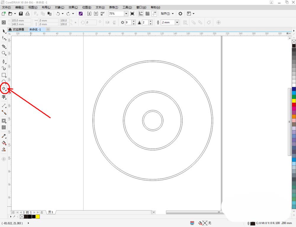 2、點擊【橢圓形工具】在作圖區域繪制一個圓形圖案后,點擊【輪廓圖】,拉動圓形圖案進行輪廓操作。完成后,點擊鼠標右鍵-【拆分輪廓圖群組】,將圓形進行拆分。同樣的步驟,完成圖示幾個圓形圖案的制作(如圖所示);