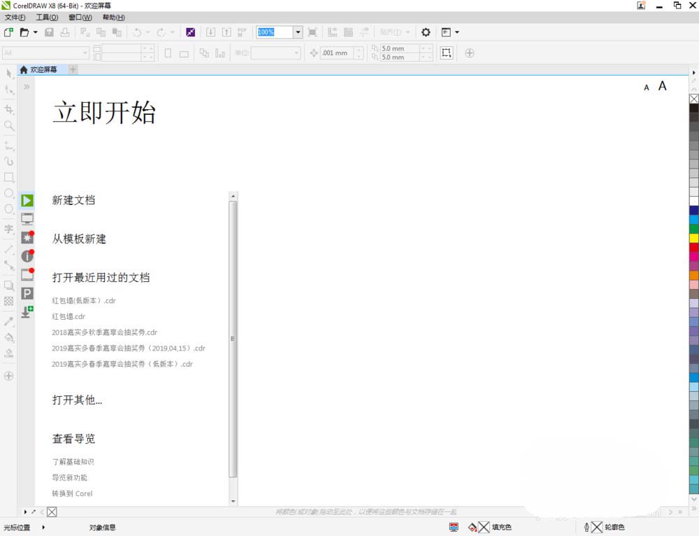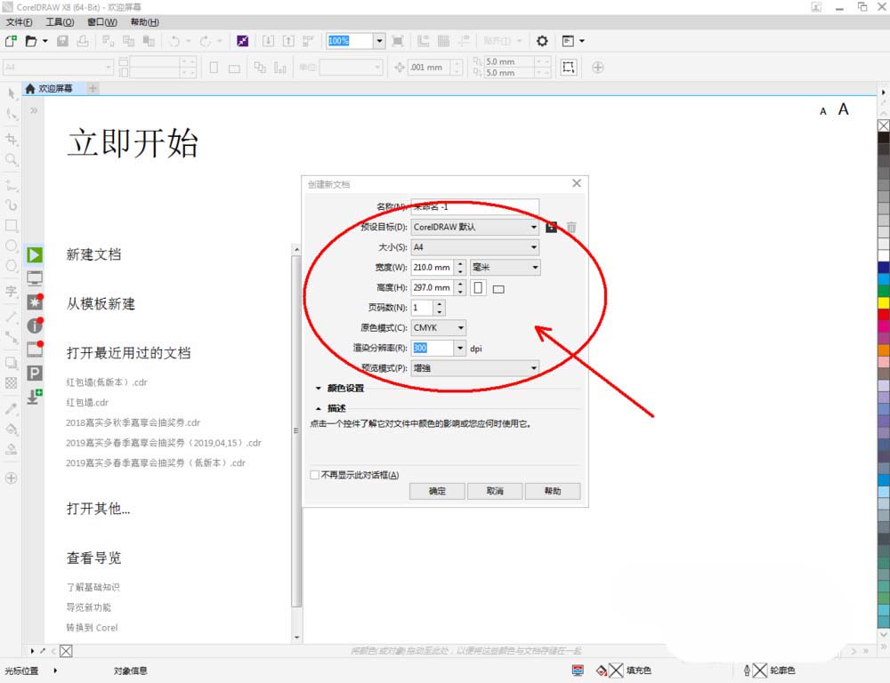 1、打開CorelDRAW X8軟件,點擊【新建文檔】,按圖示參數新建一個cdr文檔;