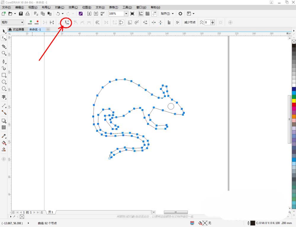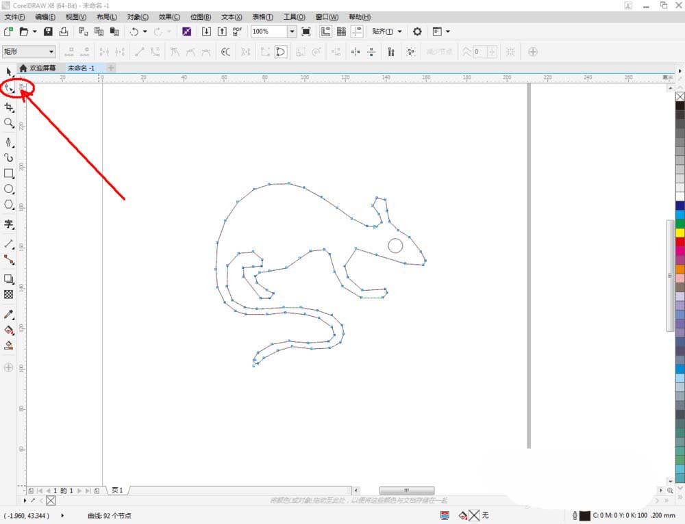 3、選中多邊圖案,點擊【形狀工具】,選中圖案上的所有點,點擊【轉換為曲線】將圖案轉曲后,按圖示調整控制點,完成整個生肖鼠輪廓圖案的繪制(如圖所示);
