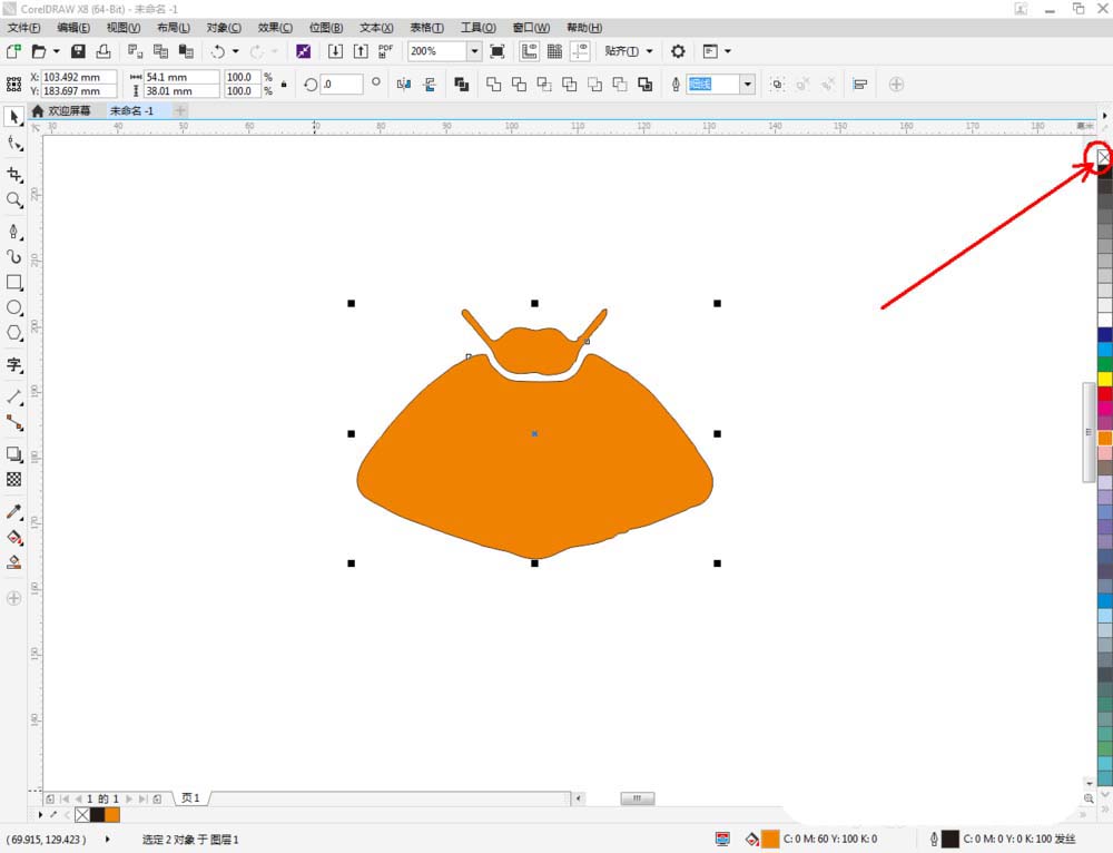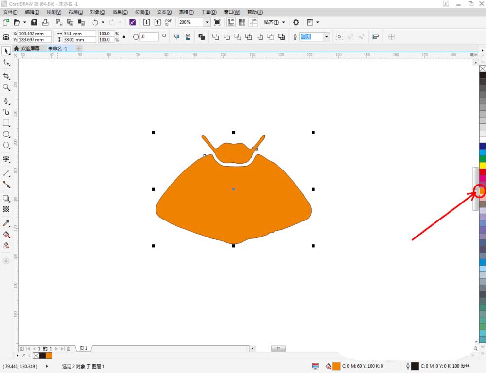 3、點擊【選擇工具】,選中整個身體部分圖案,鼠標左鍵點擊右邊色板中的橘色色塊,將其填充為橘色。點擊【鋼筆工具】繪制出巨蟹座符號后,鼠標左鍵點擊色板中的白色,將符號填充為白色。最后,選中整個圖案,鼠標右鍵點擊色板中的×,去除圖案描邊(如圖所示);