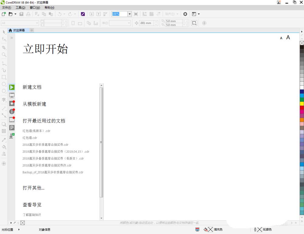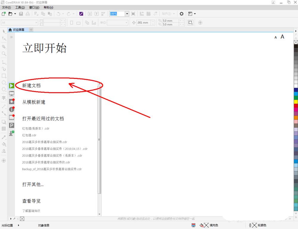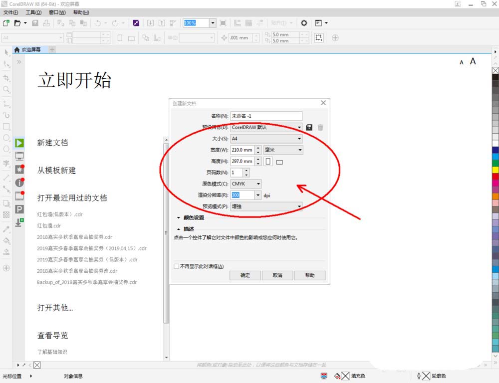 1、打開CorelDRAW X8 軟件,點擊【新建文檔】,按圖示參數新建一個cdr文檔(如圖所示);