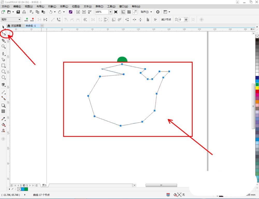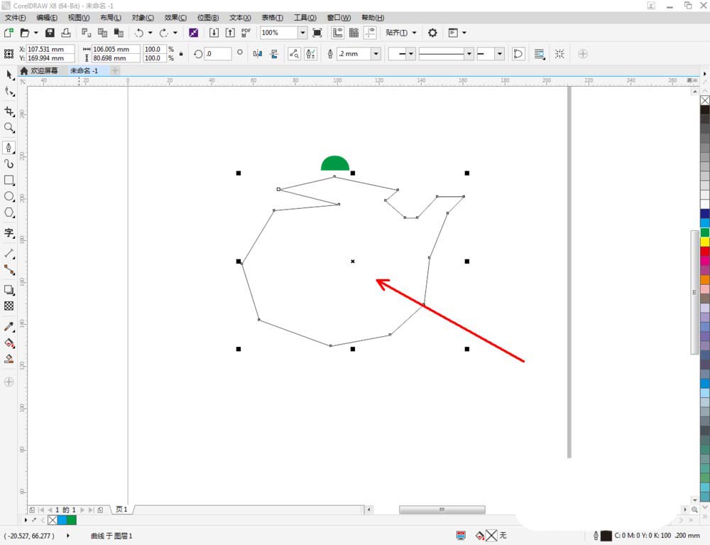 3、點擊【鋼筆工具】,在作圖區域繪制一個多邊圖案。點擊【形狀工具】,框選整個圖案后,點擊【轉換為曲線】將圖案上的點轉曲。選中圖示圖案上的點,點擊【平滑節點】調整好控制點,完成壺身圖案的繪制并為其填充顏色(如圖所示);