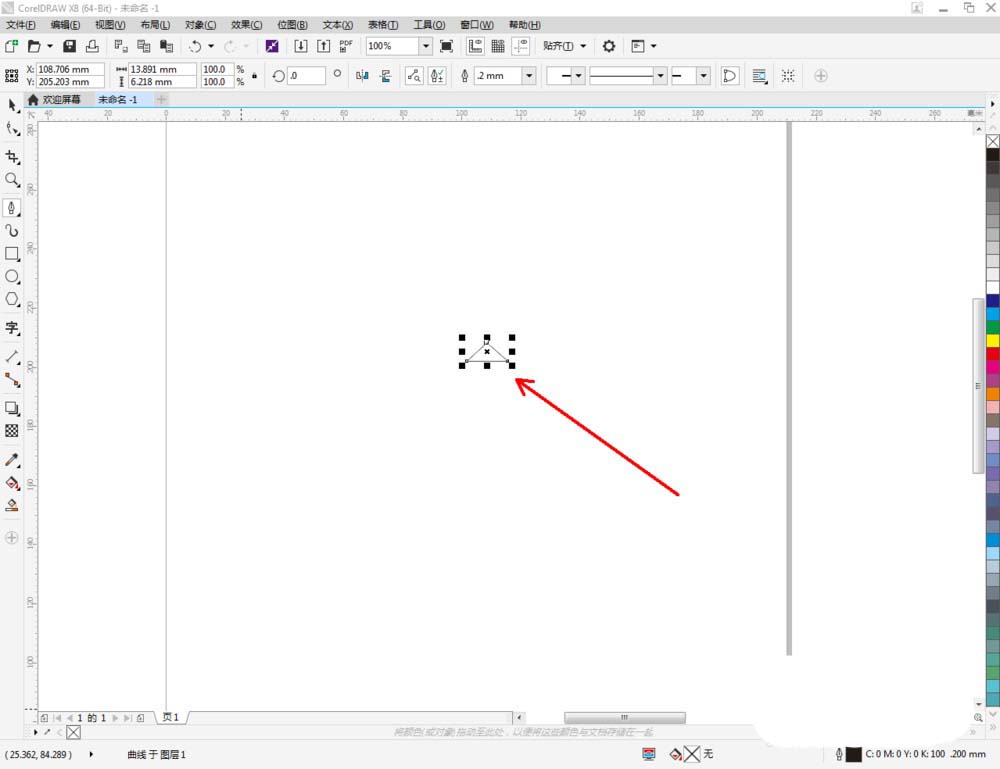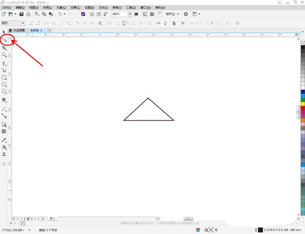 2、點擊【鋼筆工具】,在作圖區域繪制一個三邊圖案。點擊【形狀工具】,框選整個圖案后,點擊【轉換為曲線】將圖案上的點轉曲。選中圖示圖案上的點,點擊【平滑節點】調整好控制點,完成壺頂圖案的繪制并為其填充顏色(如圖所示);