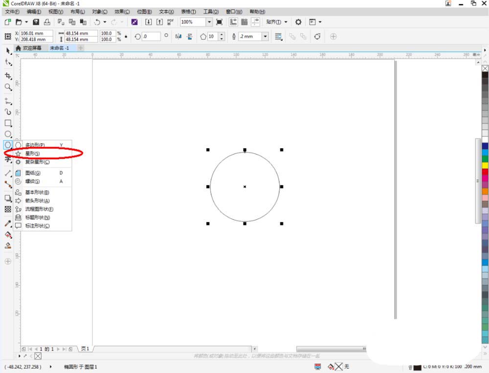 2、點擊【橢圓形工具】,在作圖區域繪制一個圓形圖案。;點擊【星形工具】在圓形圖案的左上方繪制一個星形圖案。完成后,調整好兩個圖案的位置(如圖所示);