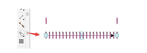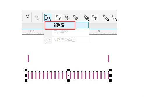 4、選擇調和好的小線段,點擊新建路徑圖標,出現黑色箭頭后點擊“e”字,這時,線段粘貼在路徑上,然后根據需要輸入短線的數量。