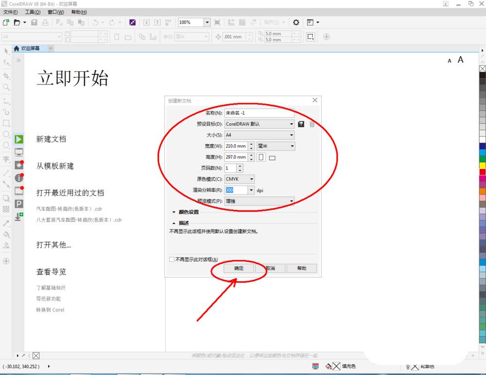 1、打開CorelDRAW X8軟件,點擊【新建文檔】,并按圖示設置好cdr文檔的各個參數(如圖所示);