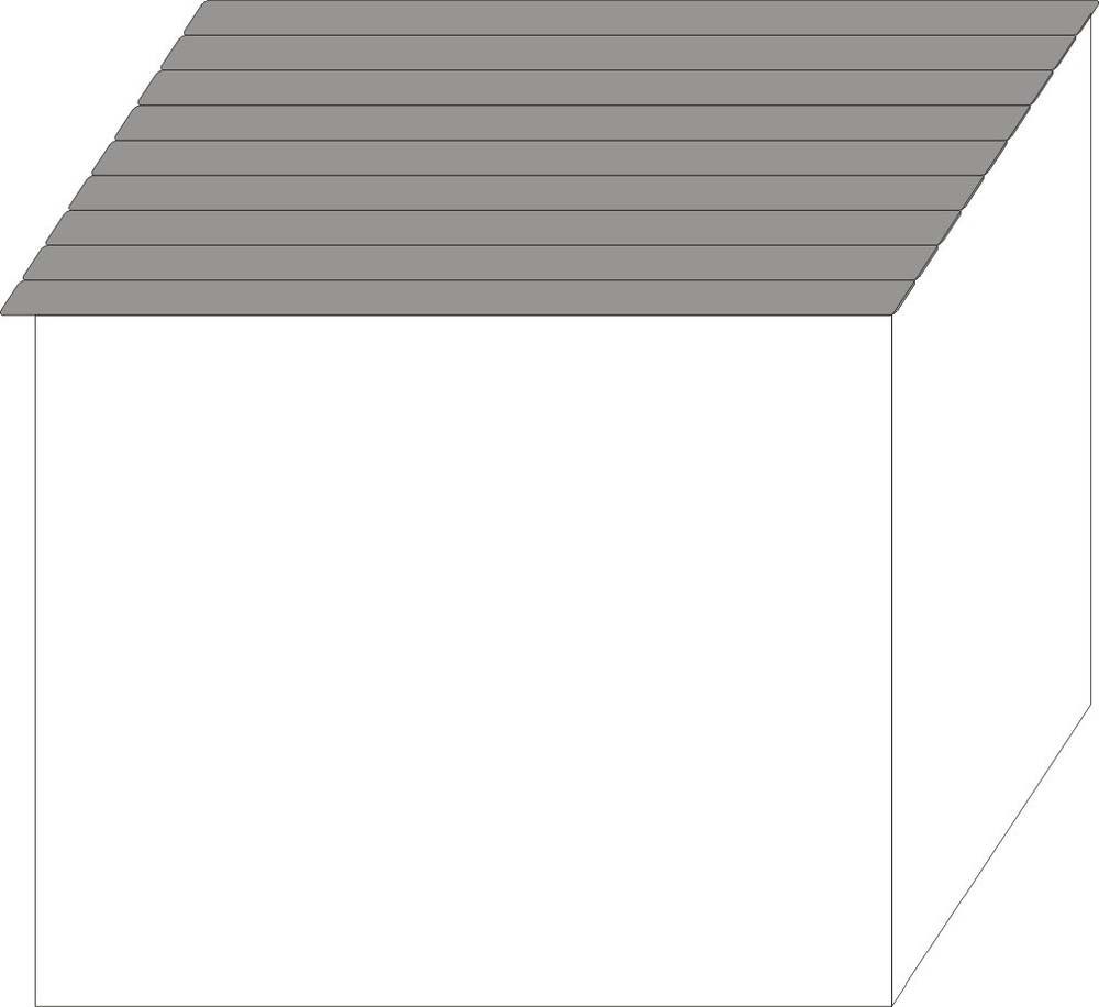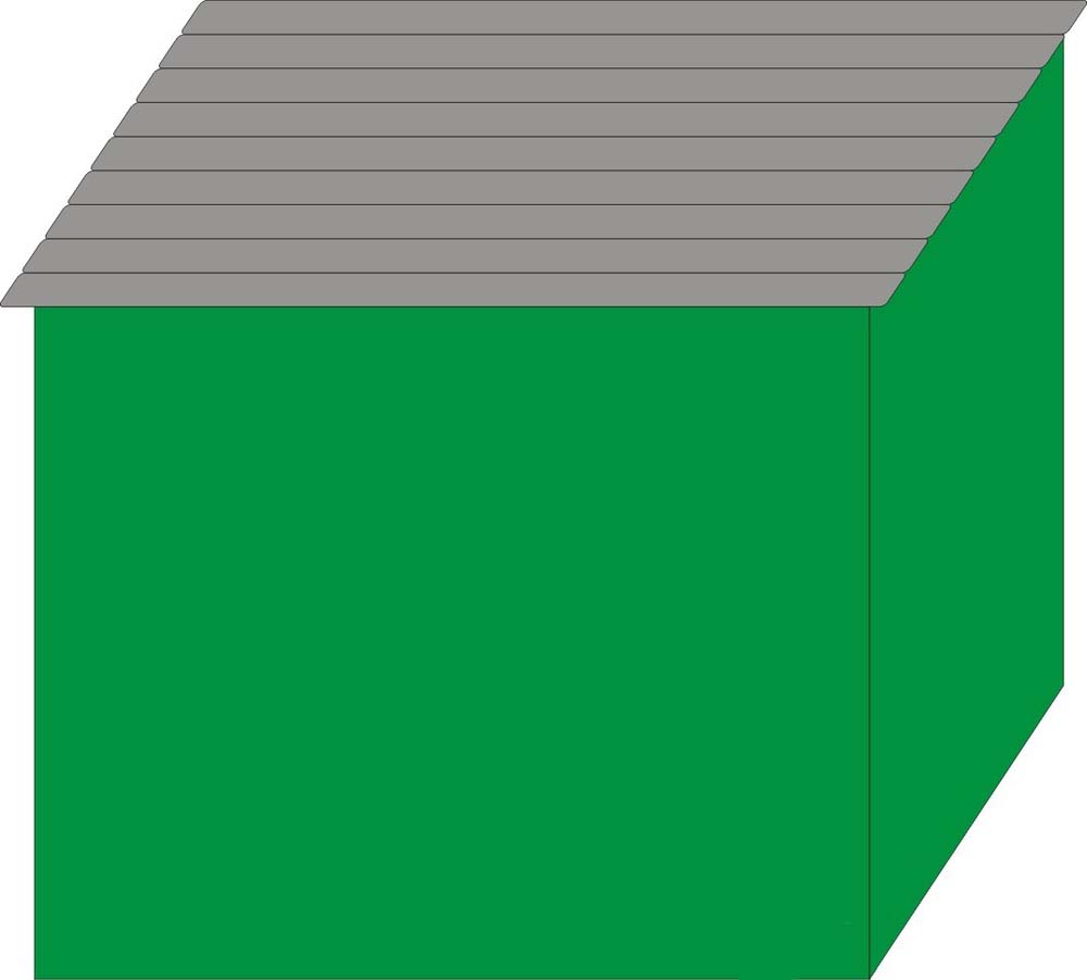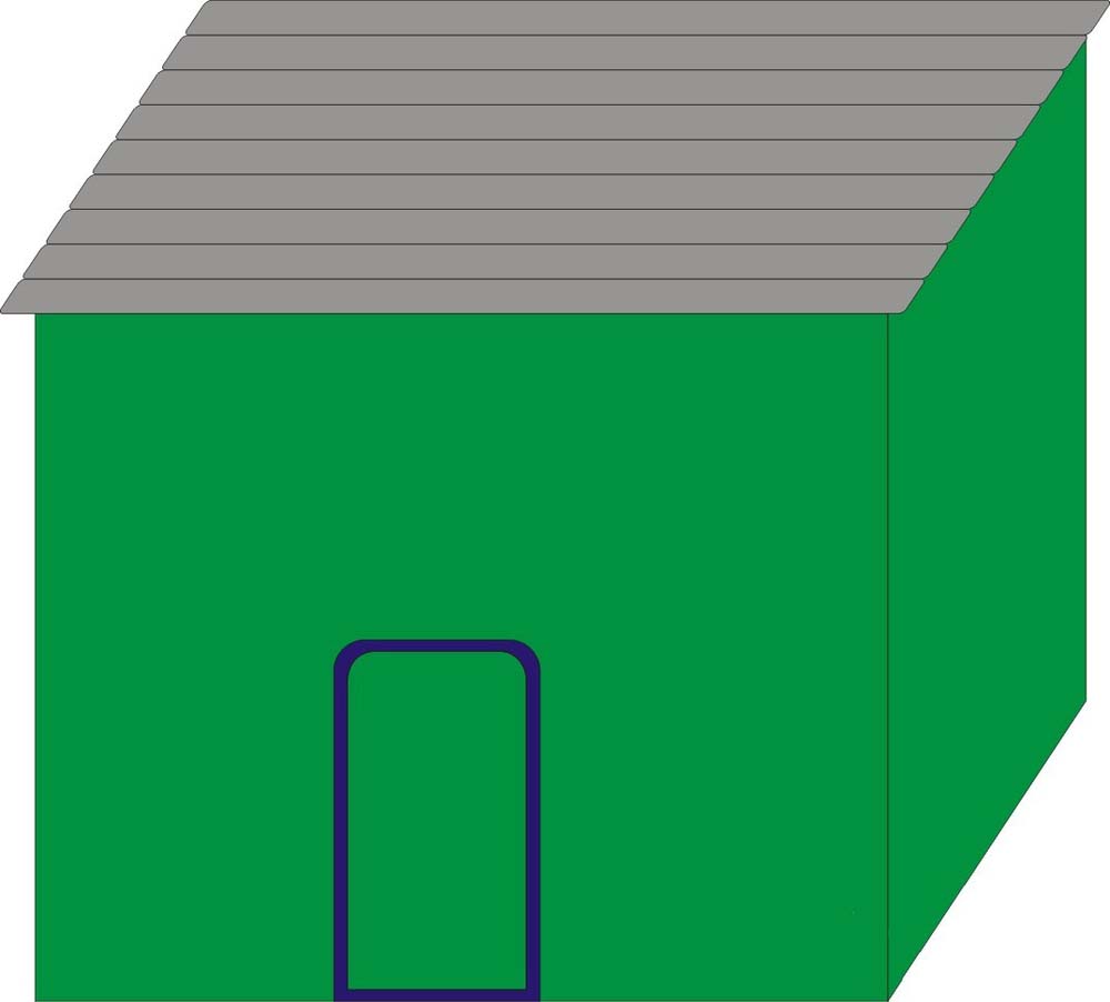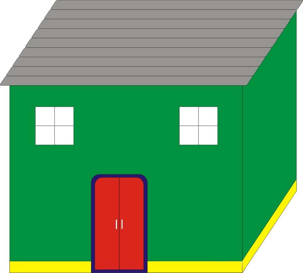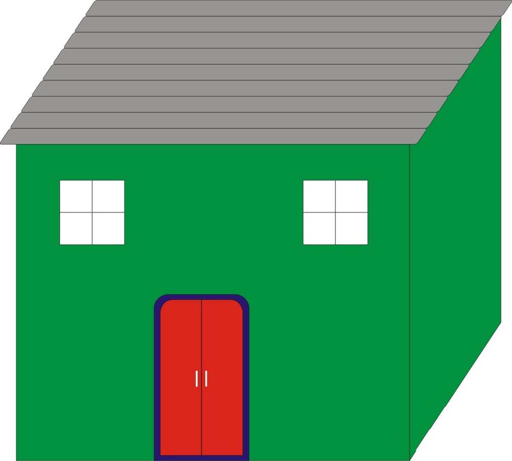 3、下面在來繪制小房子的墻體部分,繪制兩個(gè)長方形放置在屋頂?shù)南旅妫疫叺拈L方形使它向上傾斜一定的角度,并把長方形填為綠色,如下圖所示。