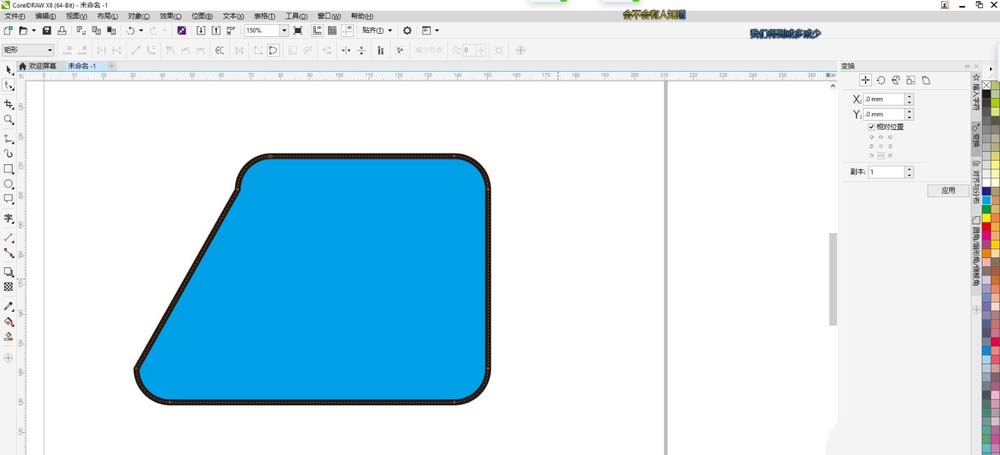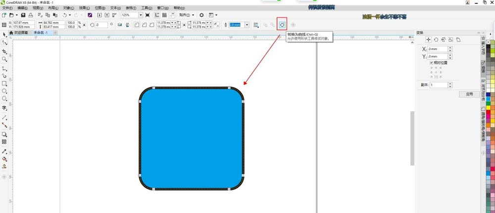 2、點擊屬性欄的轉曲工具,或用快捷鍵CTRL+Q把圖形轉曲線,轉曲后則可以進行自由變換,點擊圖形任一邊加上一個節點,拉動節點,則改變了圖形形狀。