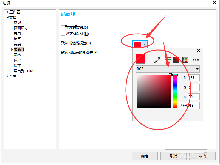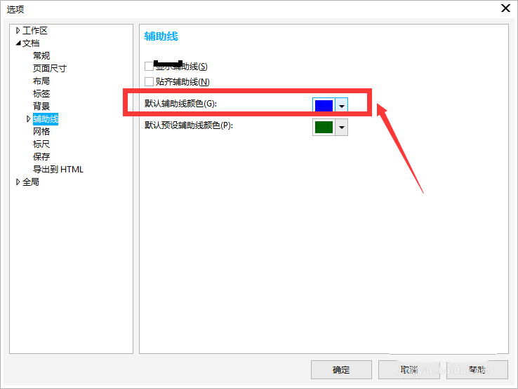 5、打開后的右側界面就會顯示輔助線修改顏色列,打開右側的顏色面板下拉菜單