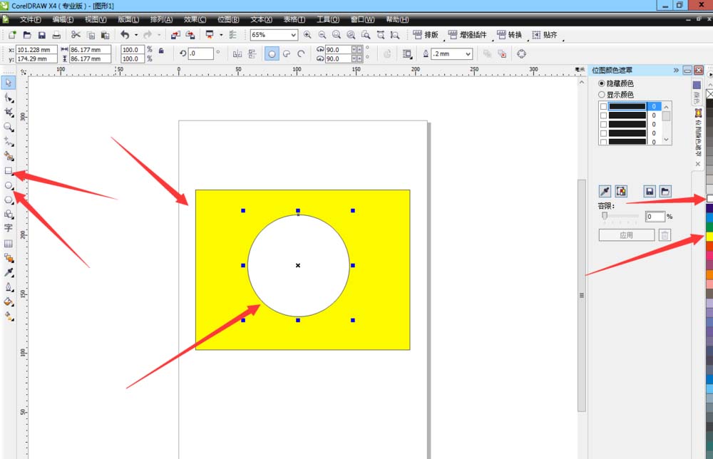 2、單擊矩形工具繪制一個矩形并填充顏色,在單擊圓形工具拉一個任意大小圓,填充白色。