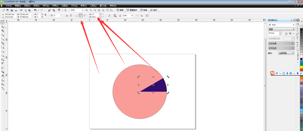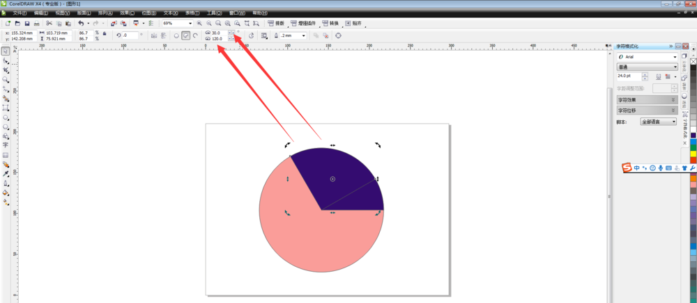 5、選擇30度的這個圓,按Ctrl+c ctrl +v,進行復制,在起始角度中輸入30,結束角度中輸入120,然后換個填充顏色,如下圖。