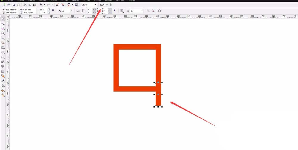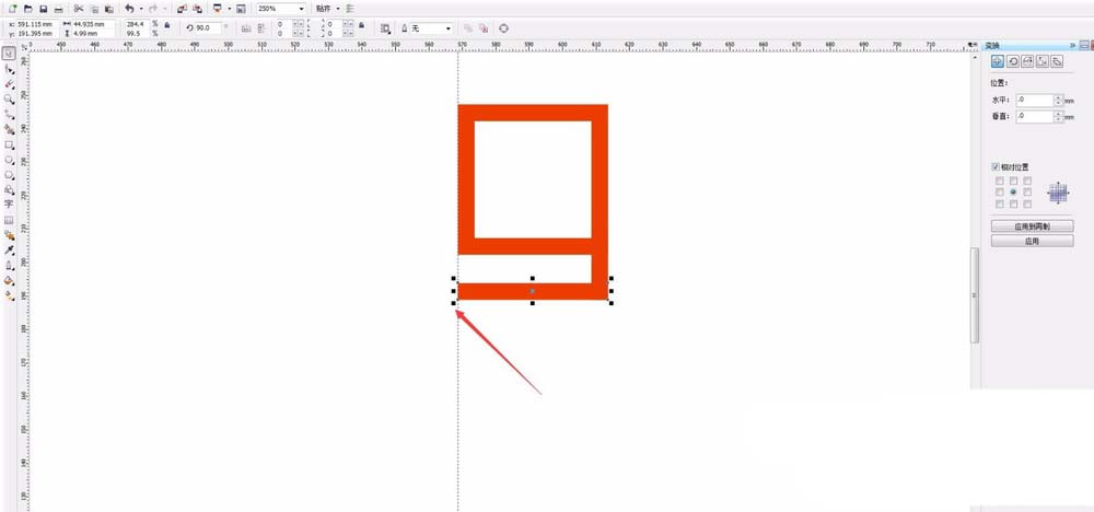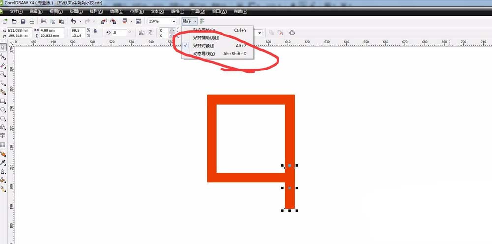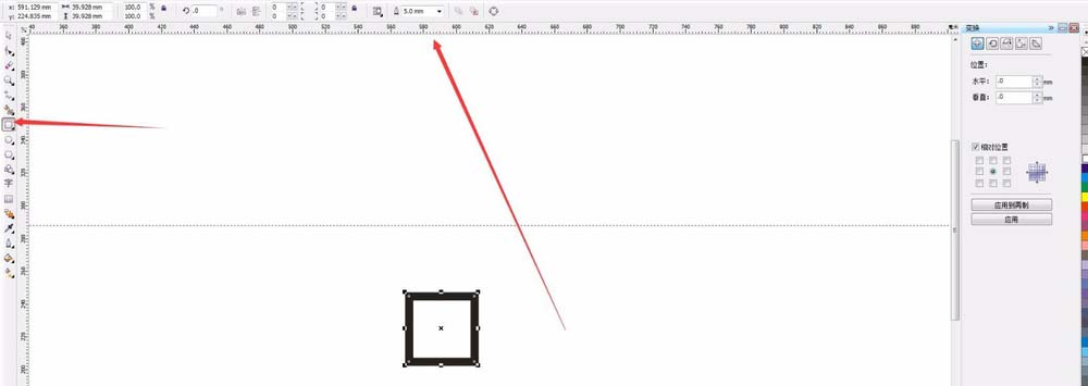 3、選中正方形,將輪廓線轉化為對象。在排列菜單中找到將輪廓轉化為對象命令。這樣就不是線了,然后在屬性欄中有一個貼齊的圖標,選擇貼齊對象。繪制一個跟正方形的邊等寬的矩形