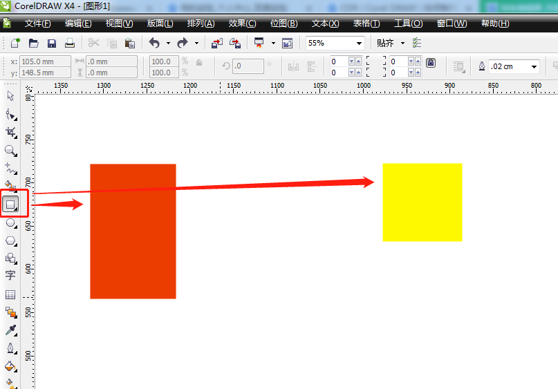 1、利用矩形工具繪制2個(gè)矩形,并任意填充顏色。(以紅、黃色為例)