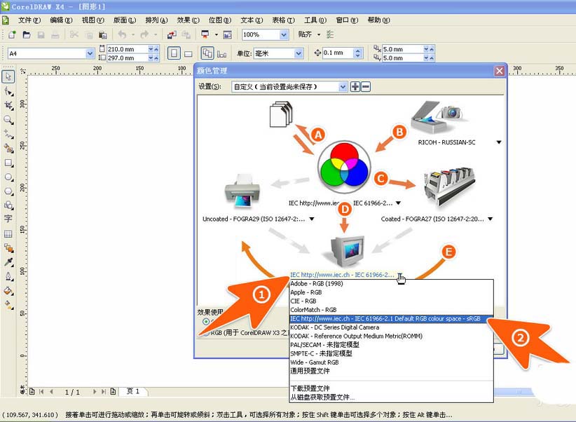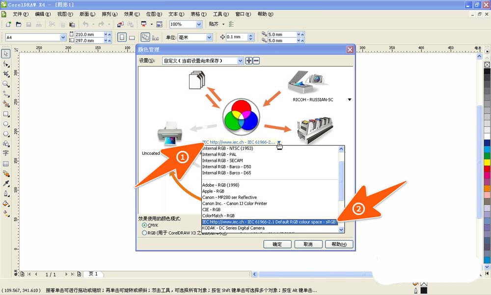 8、再把CMYK后面的選項,調成和下圖箭頭1所指的一樣,另外,再下面的各項設置也調成和下圖中框2里面的各項一致,然后點擊確定,這樣設置后,現在CDR的顏色就和PS的顏色一樣了。