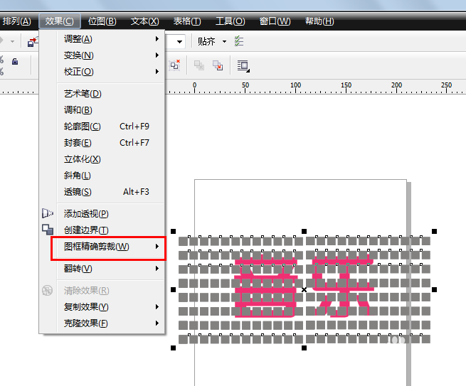 4、先選中方格,點擊“效果”-“圖框精確剪裁”-“放置在容器中”,點擊一下文字。