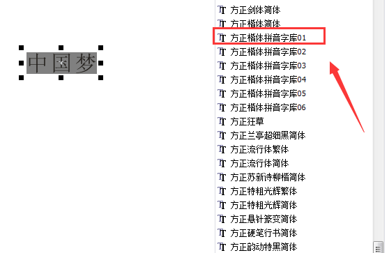 5、點擊字體里的下拉箭頭在其下拉列表里找到方正楷體拼音字體庫1選項,如圖所示: