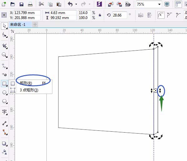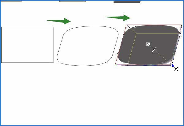 2、用“矩形工具”在右邊畫出小矩形,按空格鍵后單擊小矩形,對準中間的雙箭頭往上移動,成傾斜狀。如圖所示: