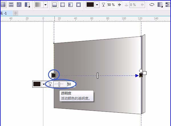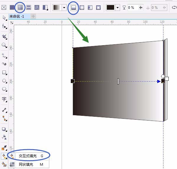 3、框選兩個矩形,按快捷鍵Ctrl+G組合對象,用“交互式填充工具”,屬性欄中如圖設置,再改透明度。