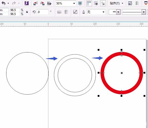4、按空格鍵切換用“選擇工具”,在屬性欄中改“輪廓寬度”為6左右,寬度和同心圓大小差不多,右擊調色板為紅色。如圖所示: