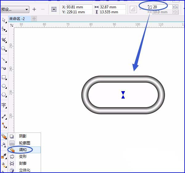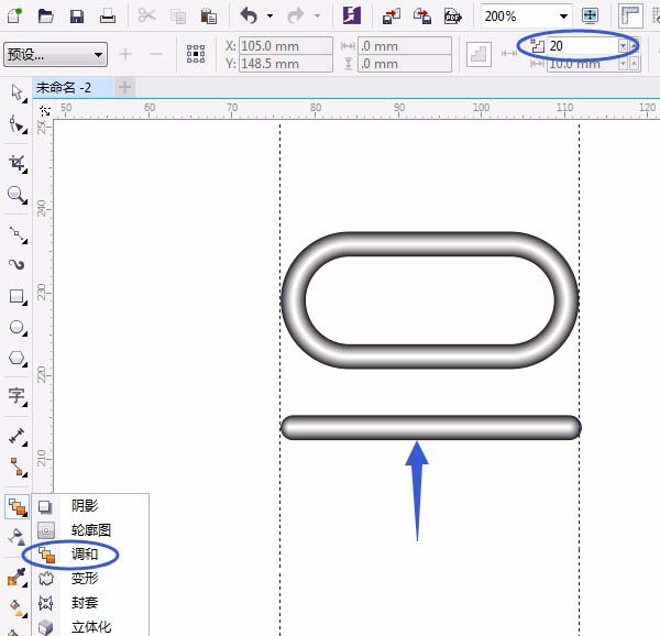 3、用“調和工具”進行調和,屬性欄中數字默認20,如圖所示: