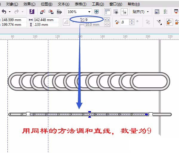 6、用同樣的方法調和直線,數量為9,比矩形調和數量少一個,如圖所示: