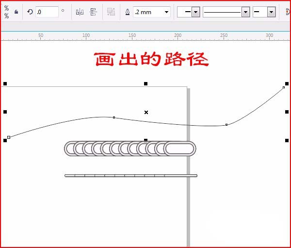 7、用“貝塞爾工具”畫圓滑些的路徑,如果不夠圓滑可用“形狀工具”調整,長度約為3-4倍于調和的對象長,如圖: