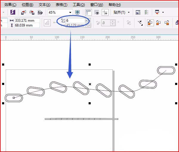 8、用“調和工具”進行調和,屬性欄中改數字,如改為6,根據路徑而改數字,再旋轉矩形,如圖: