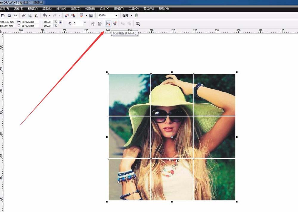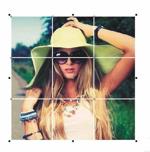 7、然后取消群組,這個時候當我們移動小方格的時候,可以看到照片真的被我們裁剪成了九個部分,而且是完全等大的。邊距也是完全相等的