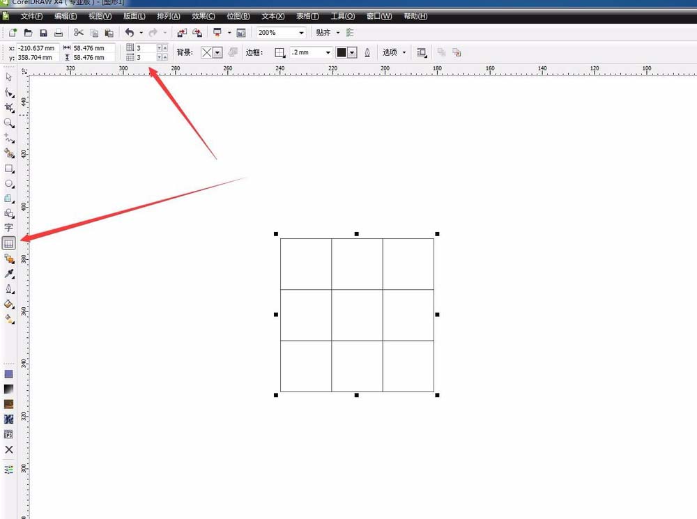 1、首先打開CDR軟件,新建一個頁面尺寸,我們設置為A4然后在工具箱中選擇表格工具,拖動繪制表格,按住CTRL鍵,繪制正方形表格使長寬相等,表格位橫向3 豎向3,一共九個格