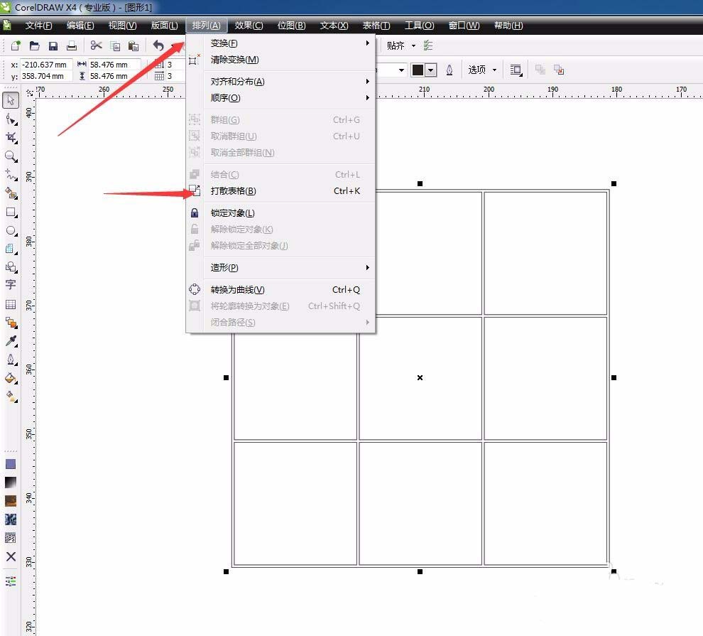 3、然后選擇打散表格,將所有群組的方框取消群組。然后選中最外邊的一個正方形,刪掉,剩下九個小的正方形。這樣做的目的是讓九個方框不但等大,各個距離之前也是完全想等的。然后將九個方框群組。這一步至關重要,千萬不能忘記。