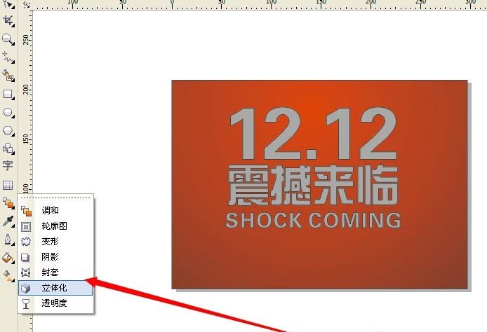 4、排好后,我們選擇立體化工具,給文字做出立體化效果。工具箱中選擇我們的立體化工具,然后選中文字,直接進行拖拉,就得到了一個立體字的效果,立體化的顏色,深度,方向都是可以手動調節的。