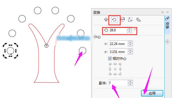 9、點擊排列菜單,設置旋轉,設置28的角度, 副本為7,點擊應用